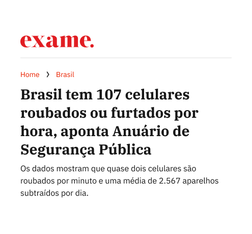 Segundo a reportagem da Exame, “107 celulares são roubados ou furtados por hora no Brasil.” (Fonte: Exame Brasil)